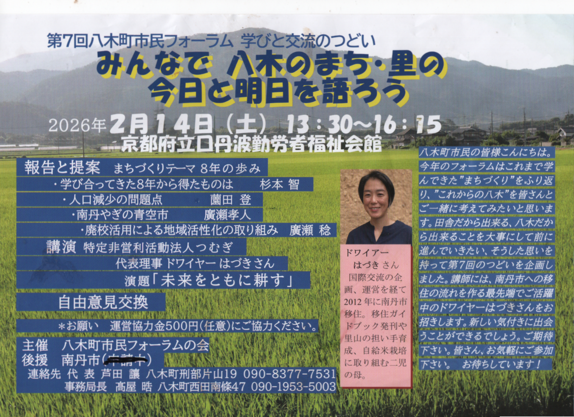 | 8日(日) | 【南丹市内】 南丹市長選挙および南丹市議会議員一般選挙 告示 【園部町】 2025なんたんヒューマンシネマ 【八木町】 京都丹波エリア演劇祭 |