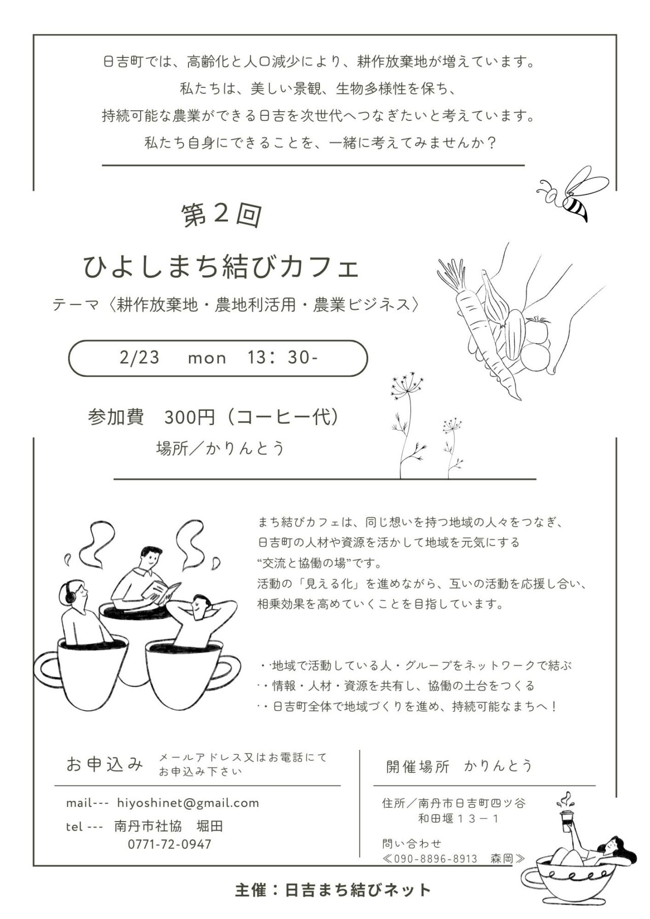 | 12日(日) | 【園部町】 農×移住フィールド講座「田んぼの1年生2026」摩気地域1回目 【日吉町】 みとき屋ジャズライブ 2人のオリジナルとジャズの名曲を ~大塚恵 & 関谷友加里 |