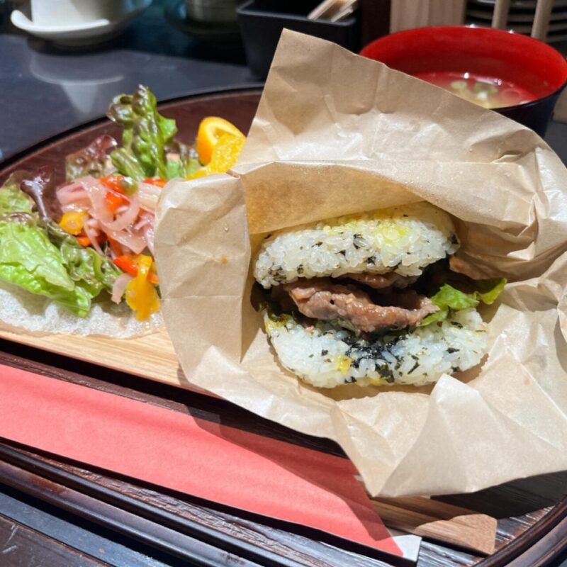 cafe 笑みの扉]ライスバーガー & cafeのお店。ランチのプレートはライスバーガー、カレー、きまぐれから選択。店舗前の駐車場 or 満車の場合は近くの公民館に。